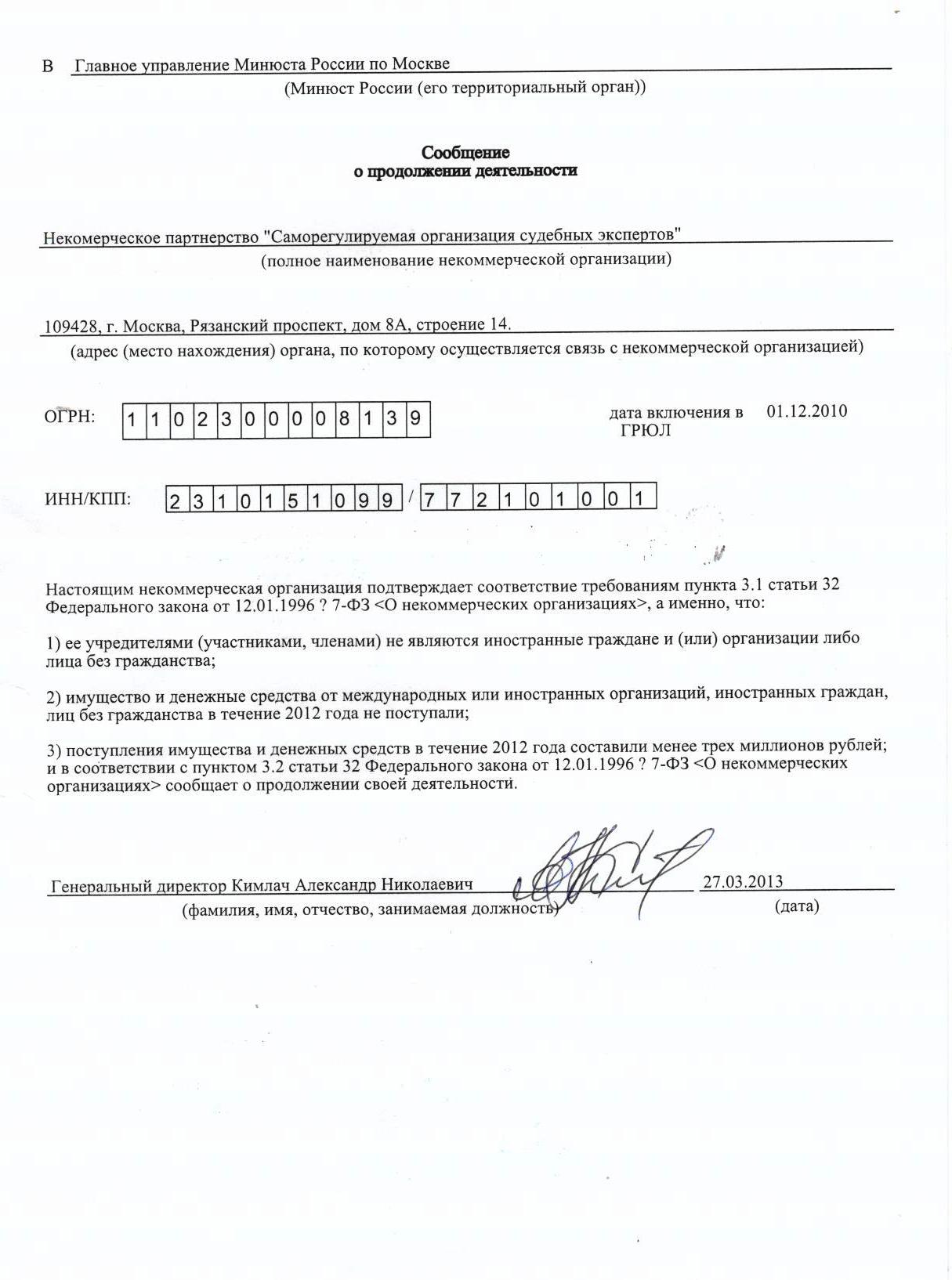 Сообщение о продолжении деятельности, 2013 г.